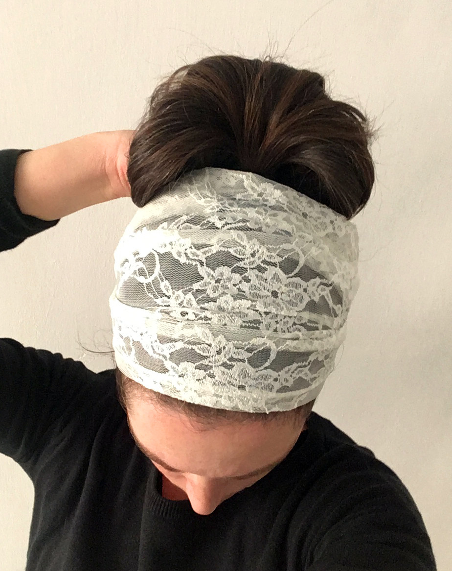 Simply tie the headband in the back. The width of the headband is adjustable by simply folding the fabric. You can wear it with your hair up or loose.